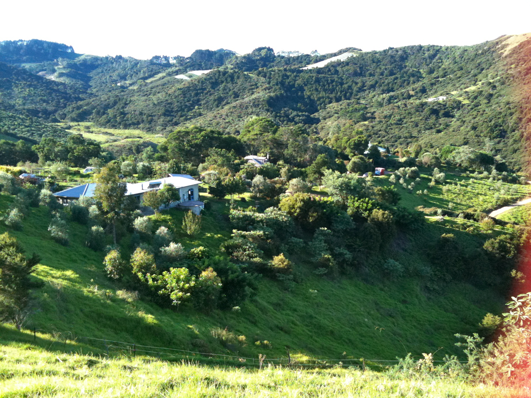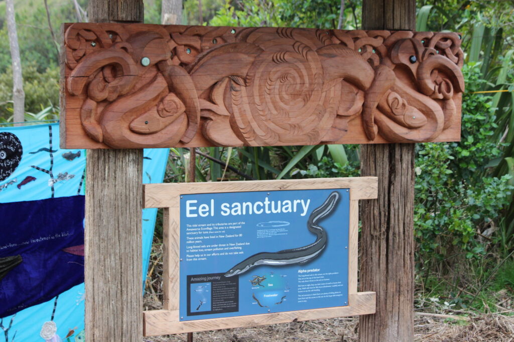 Awaawaroa Bay Eco-Village owns 169 hectares (420 acres). There is a large wetland and estuarine system and a number of large pockets of regenerating bush. The village established NZ’s first private sanctuary for the endemic long finned eel (tuna – a Maori word for the eel). A large section of the bush is covenanted with Department of Conservation. To protect the native wildlife there are no cats or dogs on the property. Non toxic and energy-efficient building materials and methods are required. An internal building code is in place that is administered by a building committee. Most families use alternative power systems and there are a number of electric cars and bikes and biofuel vehicles on the property. A communal tractor shed/barn has been built as well as a multi-purpose mud-brick community house and an accompanying abolution block which are used for meetings, celebrations and various group activities. We aim for a chemical-free environment with all land-use practices to be organic. All land use is organic and several members practise Bio- dynamics. One land-base businesses operate from the community – a certified organic nursery ‘Gulf Trees’ which grows native fauna and another is in the process of being established. Protecting and enhancing biodiversity in our ecosystems and natural habitats is a priority.