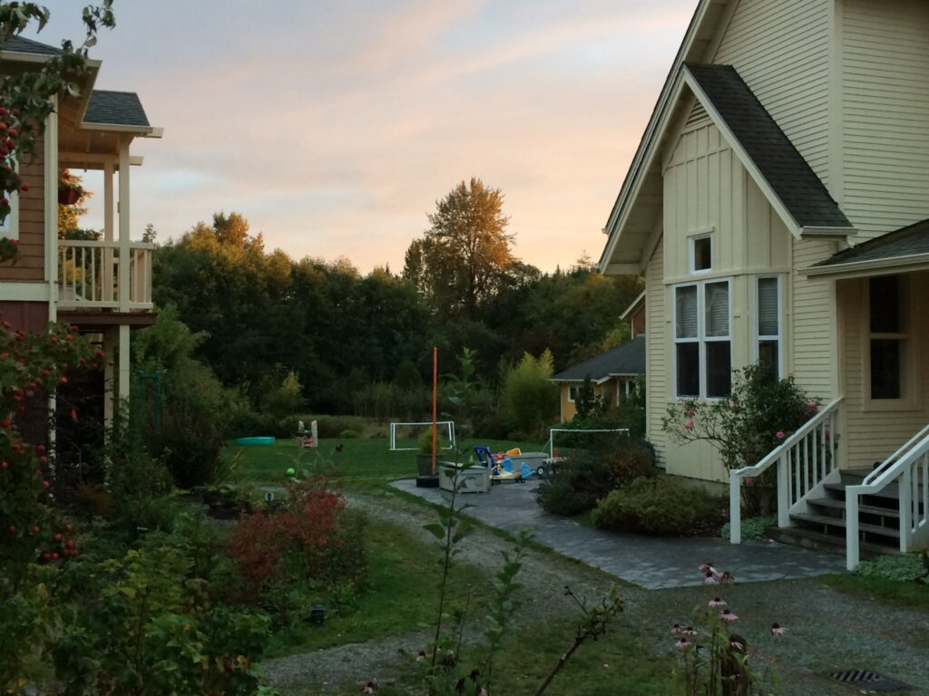 The mission of Bellingham Cohousing is to work together to create a diverse multigenerational neighborhood of 33 homes on the historic Donovan Farm site. We intend to be supportive of one another, share resources, and strive to be stewards of the land. We aspire to collaborate with the larger Bellingham community to build housing for mixed-income households. Bellingham Cohousing is a living situation that requires considerable neighbor participation. Bellingham Cohousing residents dedicate as much as 20 hours per month attending committee meetings, planning meals and community activities, and working on community projects. Although Bellingham Cohousing is a supportive community, it is not designed or intended to be an environment for individuals needing therapeutic levels of attention or care. Bellingham Cohousing offers many opportunities for neighbors to develop and foster a sense of community through: Optional common meals several times a week Working together on projects around the site and in groups and committees Managing our community together through consensus-based decision-making Community-wide celebrations of major life events: Already we have had 2 weddings and fantastic birthday celebrations And…casual discussions, book groups, salon-style discussions, a regular mid-morning coffee klatch, barbecues and potlucks, performances and talent shows, impromptu dinner concerts, and other shared activities ranging from shopping expeditions to sea kayaking and backcountry skiing