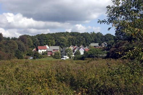 Cherry Hill Cohousing set out to create a living environment that encourages a strong sense of community, supports our need for privacy, makes life affordable, and provides a secure and enriched setting for children and adults. We have a place where people know their neighbors in a meaningful way, a neighborhood where different traditions and values are respected, and where we can all have a sense of security and belonging. Even after so many years together, we are still a work in progress, continuing to get better and better at living our values and goals. Our group purchased a 23-acre meadow site in North Amherst where we built 32 units and a large common house, moving in June – September 1994. We built a clustered mix of single, duplex, and triplex buildings on seven of those acres. The rest is field and woods, surrounded by town lands. Residents own their own homes, as well as a share of the land and the common house. The common house is a place for weeklhy community dinners, meetings, entertainment, and other public and private functions. It includes a large kitchen/dining room, children’s playroom, guest rooms, laundry facilities, library, sauna, exercise room, and recycling center. We have optional (but well-attended) dinners two nights a week, gardens, play and work spaces, hiking trails, and other shared amenities chosen by residents that have social and economic advantages. The community is a short walk from a municipal lake; a recreation park with tennis, swimming, and playing fields; a small shopping center; a library; the university; and public transportation.