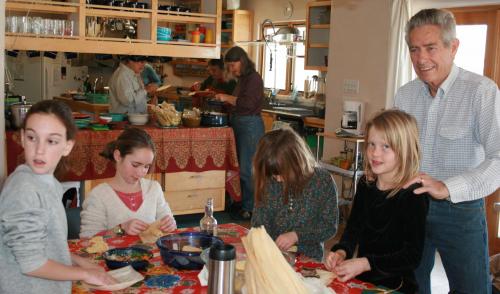 The Commons on the Alameda is a pueblo-style cohousing community on 4.5 acres at the edge of the city of Santa Fe. Construction began in 1991 and the last homes were completed in 1997. Our common house is adjacent to our main plaza. Our 28 homes cluster around four beautifully landscaped smaller courtyards that we call “placitas”. We eat communal organic meals on Mondays and Thursdays using local and organic produce as much as possible. Residents participate in the cooking and cleaning up for one meal per month; the remainder of their eight hour per month service commitment involves various endeavors including landscape maintenance, newsletter production, and childcare. Committee chairs (kitchen, guest room, grounds, etc) orchestrate much of the nitty-gritty. We have two community meetings per month–one to discuss and make consensus-based decisions regarding business items and the other to share on a more personal level. Every fall we host our community celebration for the greater community with tree planting, cider making, entertainment, green chili stew, and dancing. We have an orchard area with a chicken coop, fire circle, and a basketball hoop. Several residents have home businesses. Many of our homeowners have rental rooms or efficiency units available. The community has three rooms available for guests of residents. We have about eighty residents, with approximately 25% of residents being children. The community remains focused on youngsters with cooperative childcare that provides childcare for meeting times and other community events. There are also play areas throughout the property.