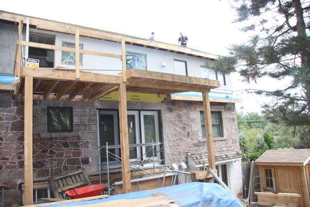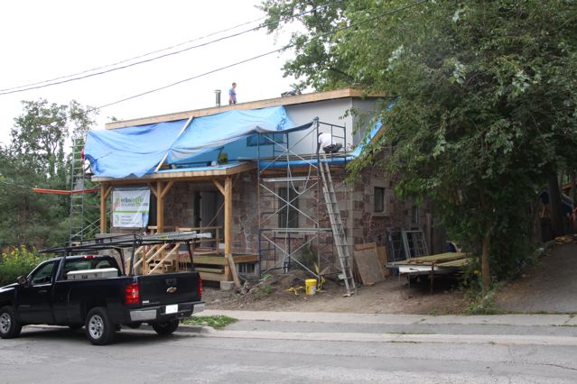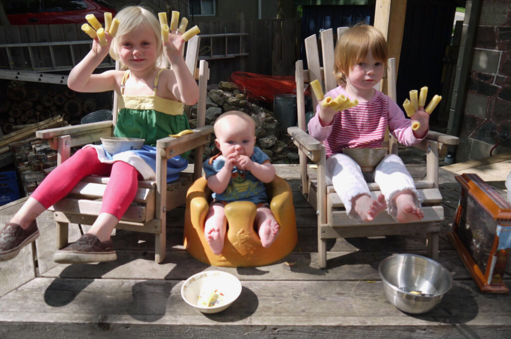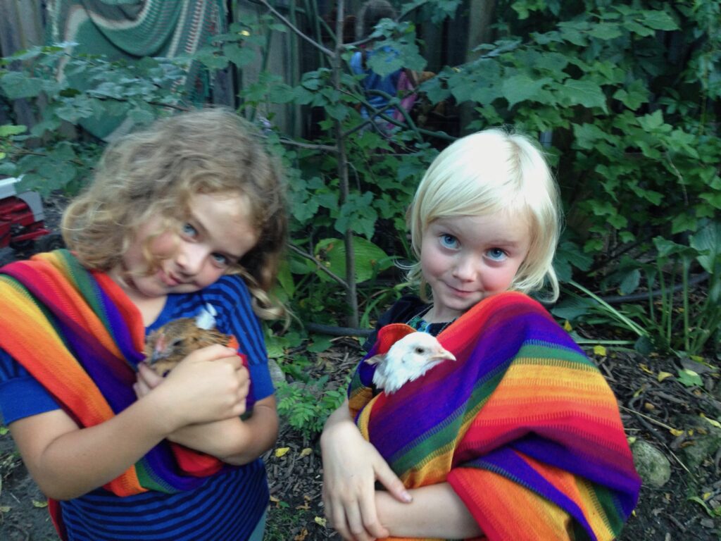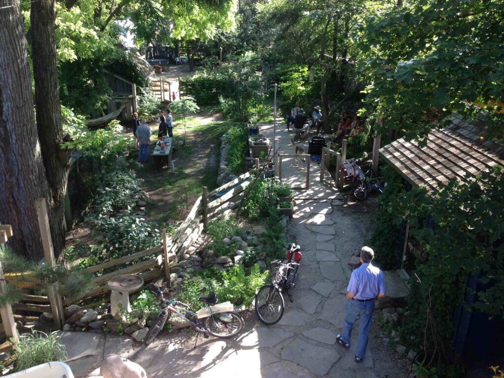 Behind the Purple Cow the two backyards have been connected creating almost half an acre of spaces for play, connection and food production. We are working to create examples of different ways to live together yet with our own spaces using bunkies, tiny houses, co-living spaces and single family homes.