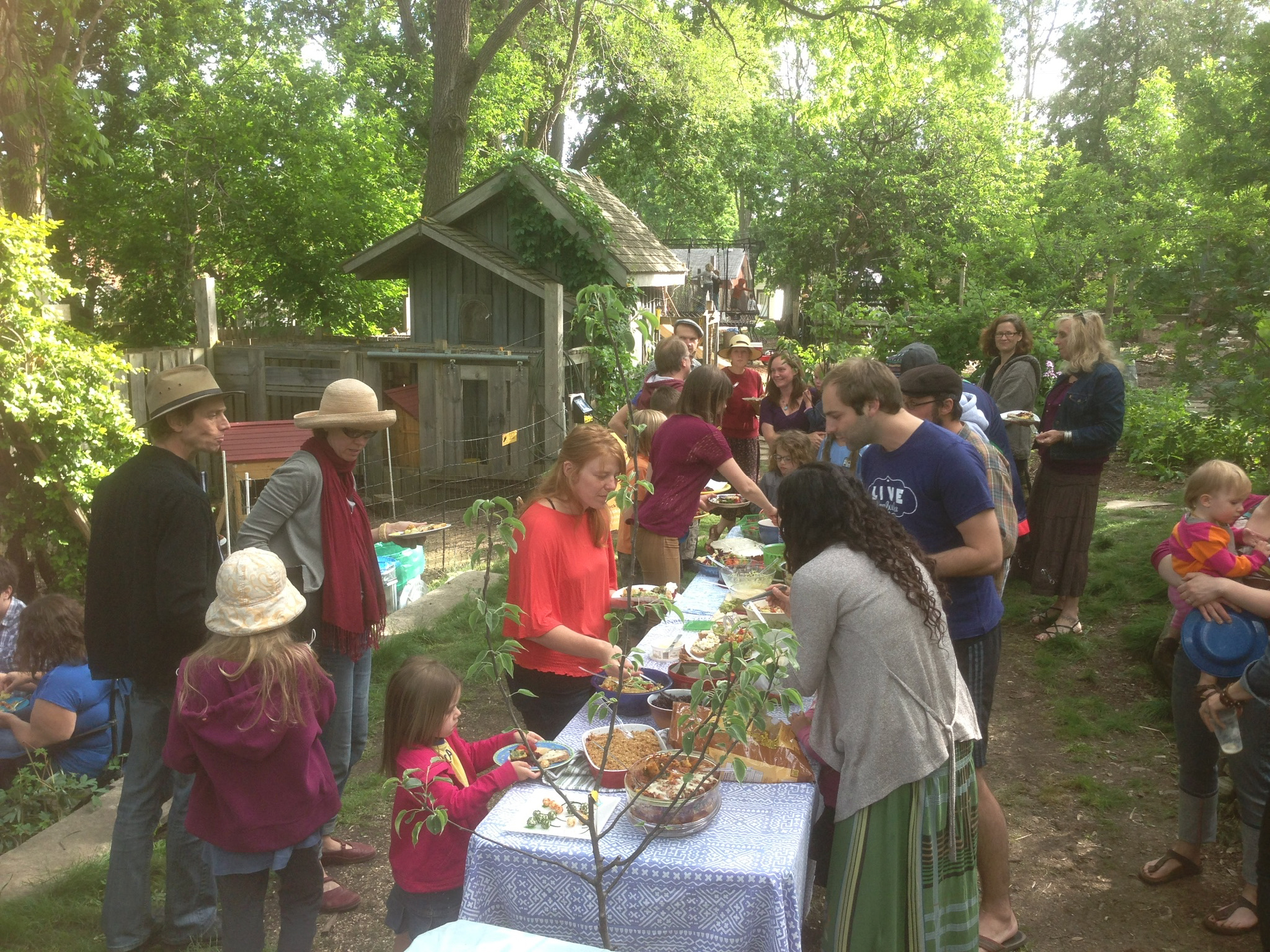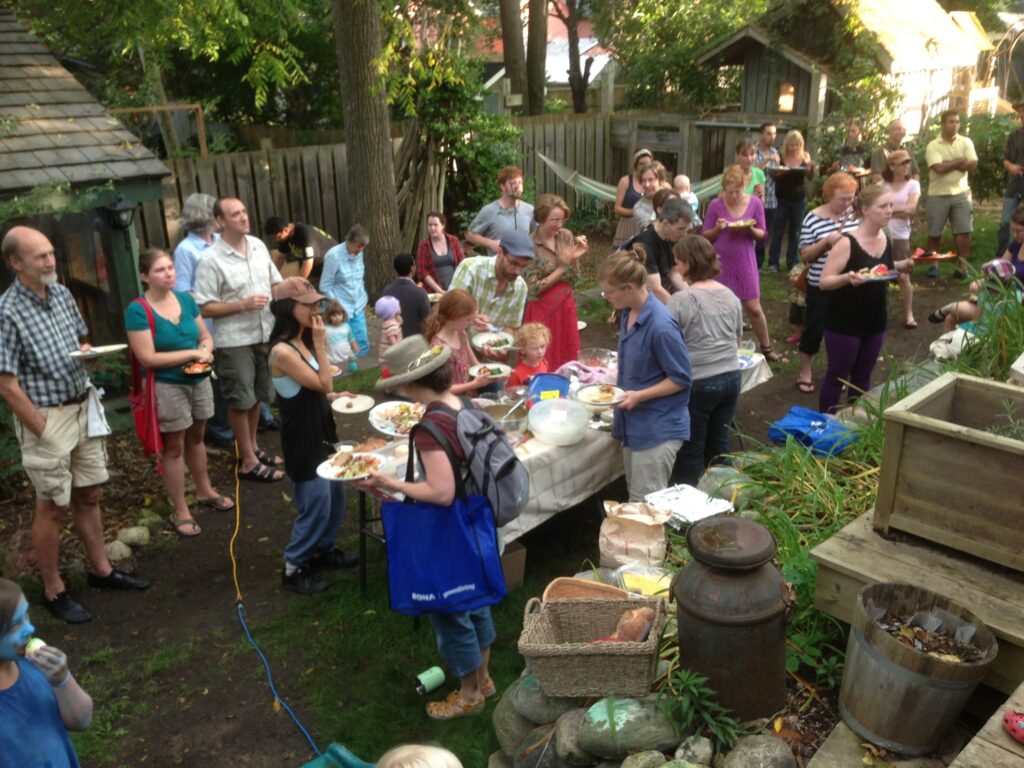 We host potlucks in the summer months as an open space for community collisions, connection, working group meetings, music, movie screenings and other wonderful things. We like it when different organizations host the potlucks and use the space to bring people together.